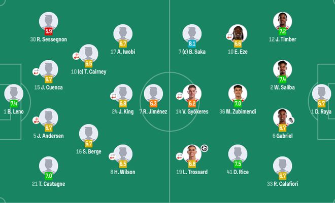 富勒姆首发:1-莱诺、21-卡斯塔涅、5-安诺森(42'31-迪奥普)、15-昆卡(82'3-巴锡)、30-塞塞尼翁、16-博格、10-凯尔尼(63'22-凯文)、8-哈里-威尔逊(82'11-阿达玛·特劳雷)、24-乔希-金(63'32-史密斯-罗)、17-伊沃比、7-劳尔·希门尼斯